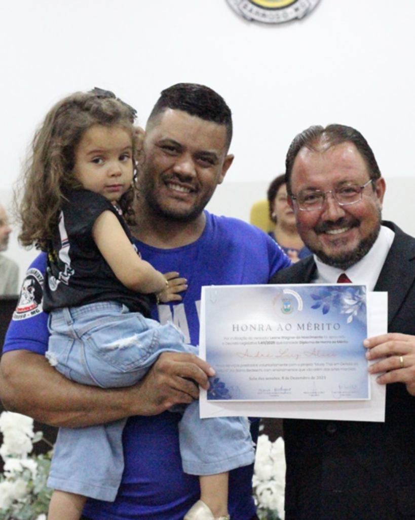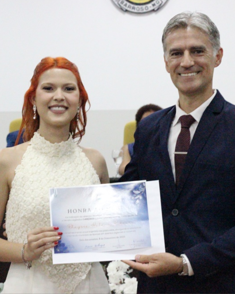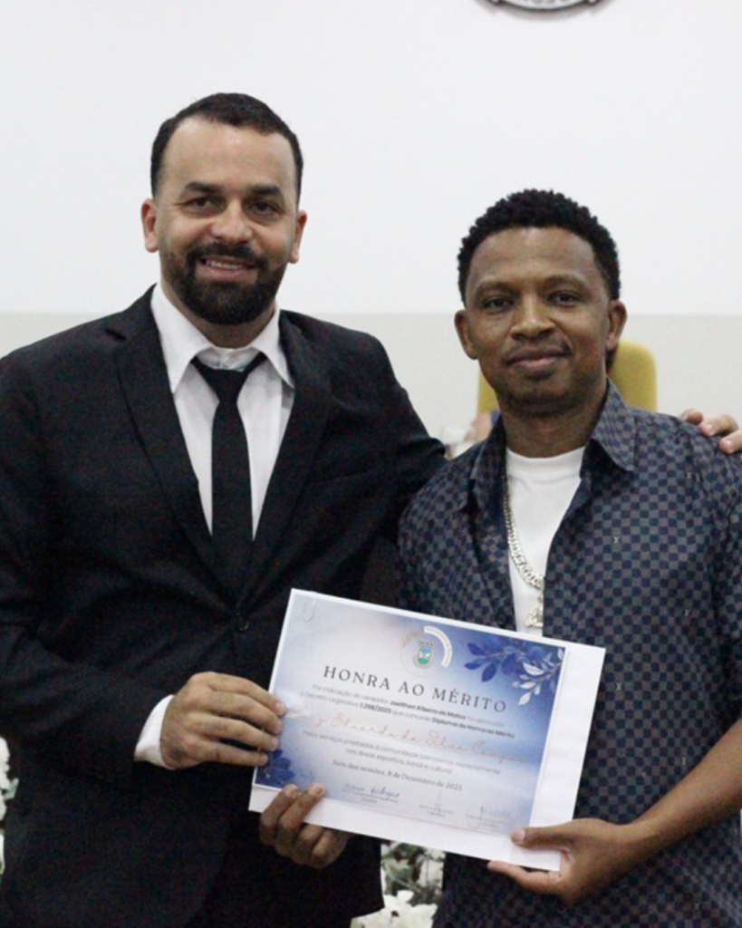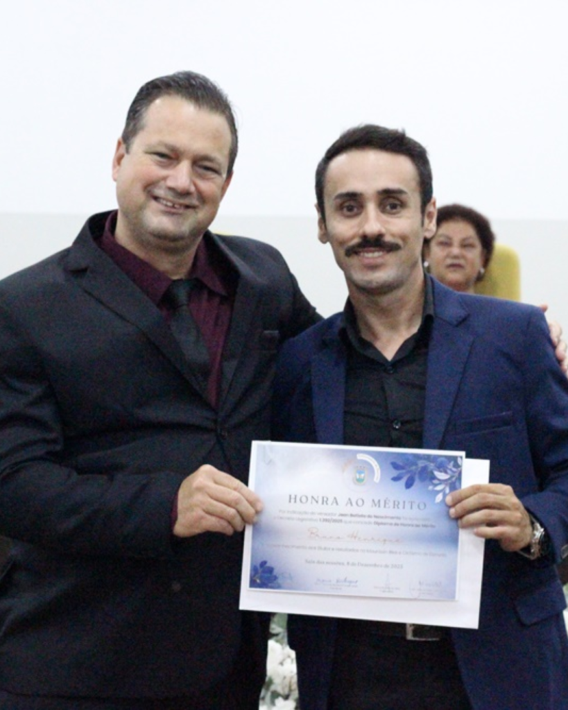 Por fim, foi entregue também a maior honraria do município, a Comenda Mário Braz de Souza, criada pelo ex-vereador e ex-prefeito da cidade, Reinaldo Fonseca. Receberam neste ano de 2025 o biólogo Marcos Magalhães, o empresário Marcelo Arruda e o padre José Raimundo.