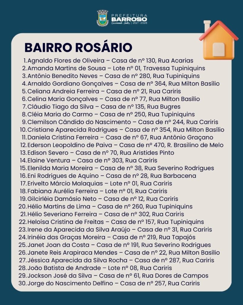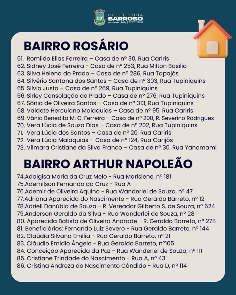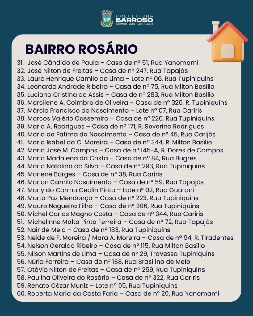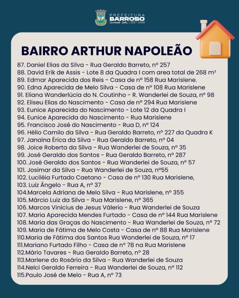 A lista com os nomes dos proprietários aptos a receber o título está disponível para consulta. Os proprietários dos bairros Arthur Napoleão, Rosário e Praia que não constarem na relação devem procurar o setor Jurídico da Prefeitura a partir do dia 26 de janeiro.
