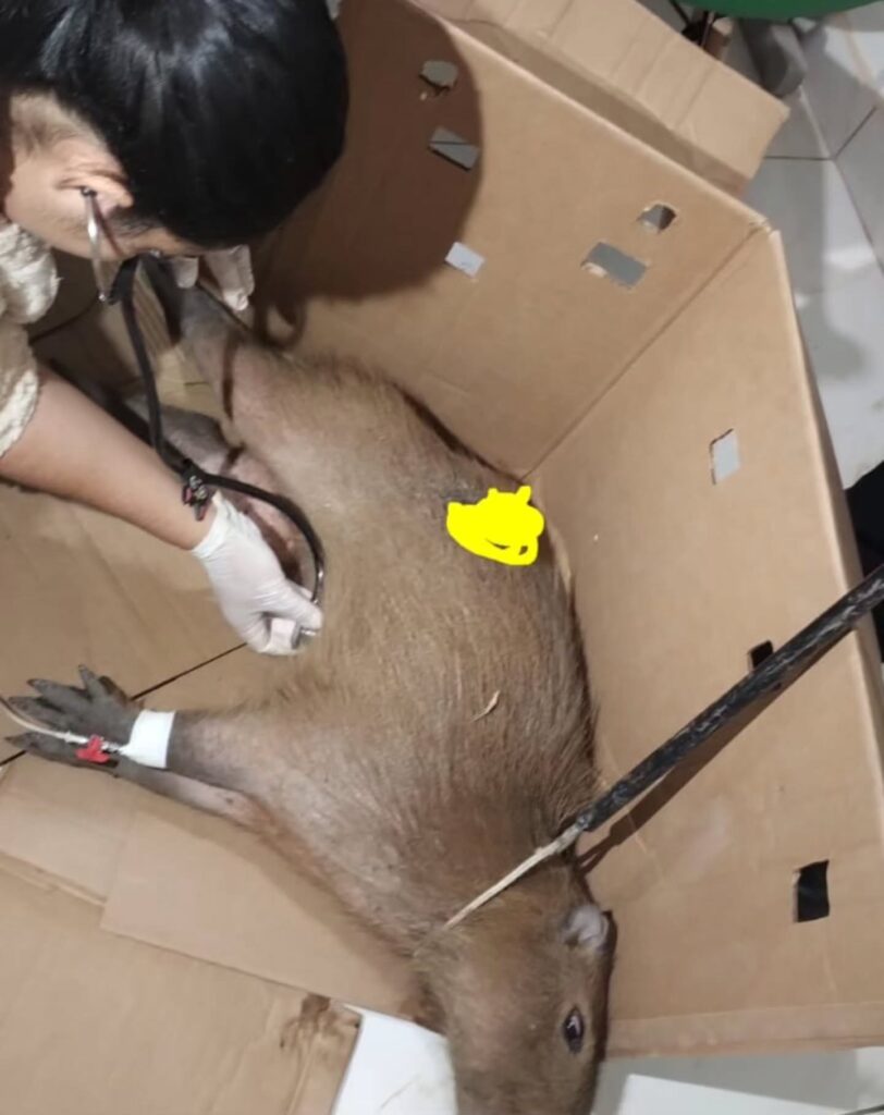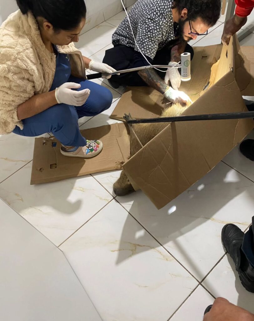 O animal foi encontrado em meio a vegetação na região da antiga linha do trem, próximo a Fábrica de Cimento. A capivara recebeu os primeiros cuidados logo após o resgate.