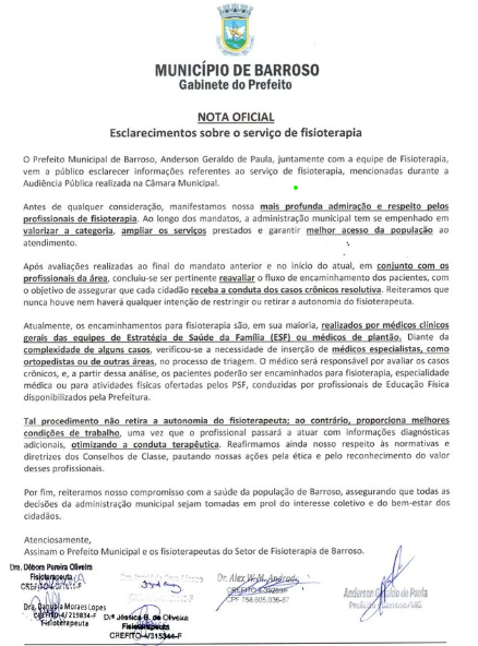 Diante das manifestações, a Prefeitura divulgou uma nota oficial, assinada pelo prefeito e pela equipe de Fisioterapia, esclarecendo as informações citadas durante a audiência pública.